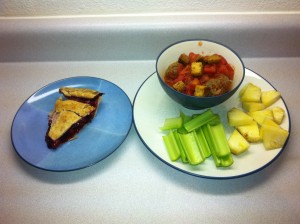 Since it’s Sunday, normally I try to finish off leftovers we’ve accumulated during the week. So for lunch today, I took 4 leftover meatballs and cooked them in a can of diced tomatoes. Then I put a handful of homemade croutons (that were too hard to be tasty on salad) on top. To go with that are some celery sticks and some pieces of pineapple, and a slice of cherry pie.