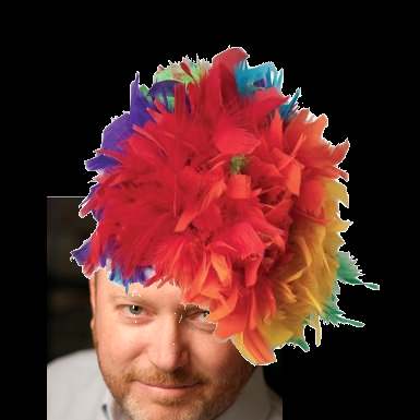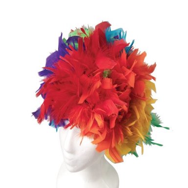 Feathers by all means. The clown wig is to “normal”. You know that your nieces love rainbows better than any other “color” (so I have been told).