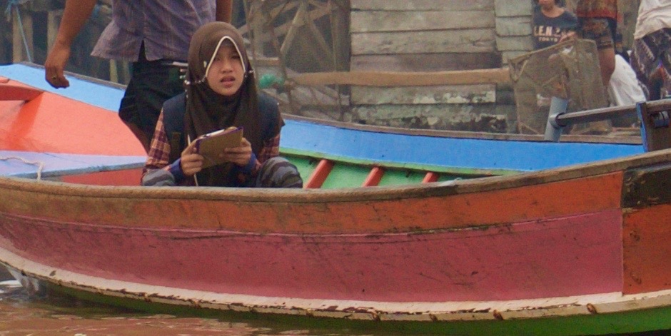 Something about this photo appealed to me. It’s a school girl getting a ride home from school from her dad in his boat. I couldn’t tell whether she was using a tablet computer or actually reading something, but she seemed oblivious to the world. The boat trip was quite an adventure. Beth, with her purse, binoculars, and camera hanging off her, almost tripped on the way down the gangplank. And the boat was so low in the water I was afraid at first we would capsize it. Siti is large for an Indonesian woman, and I’m huge compared to Indonesian men, and Beth is much larger than most Indonesian women. So with the three of us plus the skinny little fisherman in the boat, we were a heavy load. But it was huge fun once we got up to speed, and we got to see people going about their daily lives on both sides of the rivers. So many people waved and smiled at us from the banks.