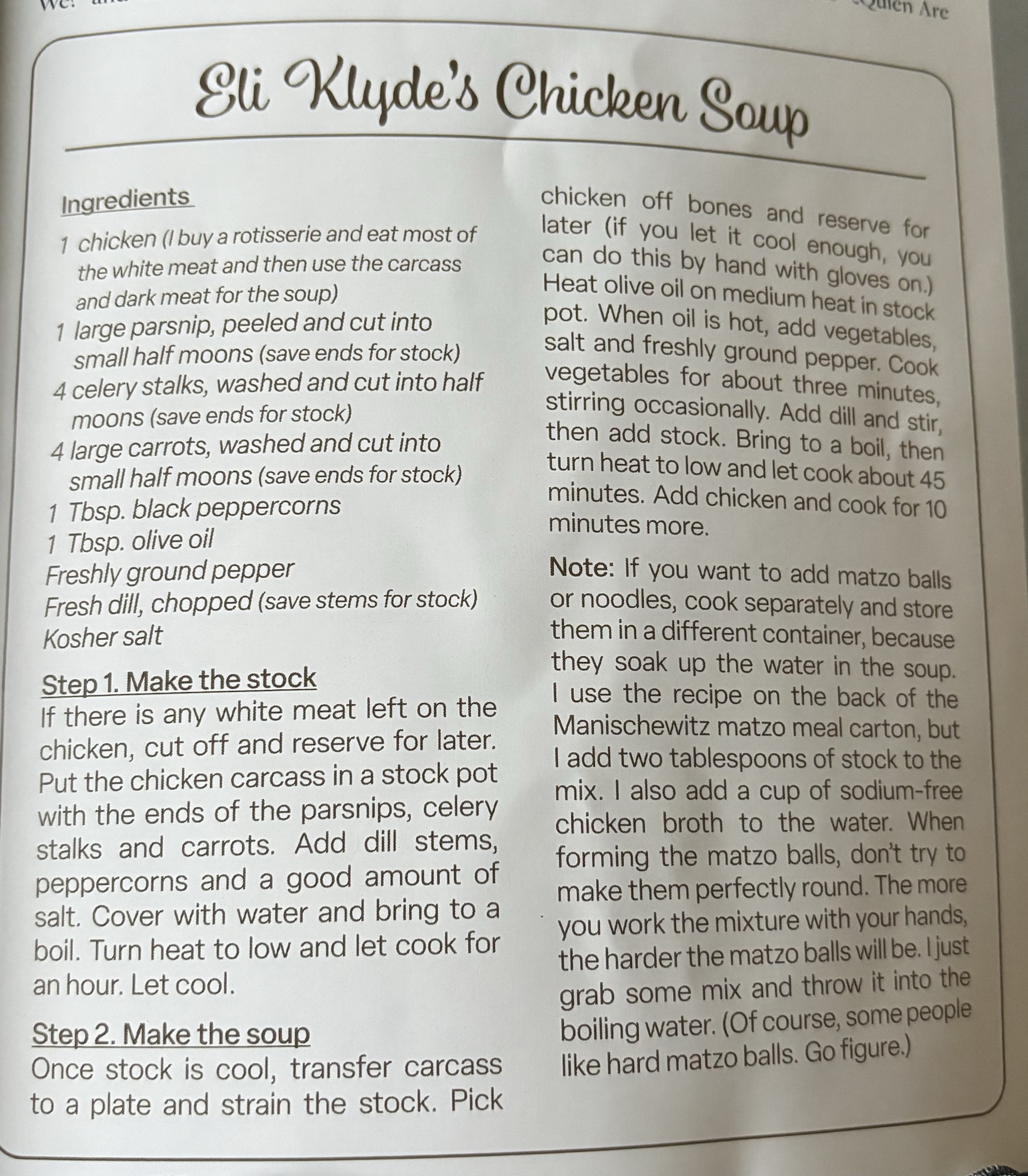 Matzo ball soup Posted Dec 24, 2023 1 min read Tomorrow is Christmas, but today I’m making matzo ball soup for the first time ever. Here is the recipe I’m using. Eli Klyde’s Chicken Soup Recipe This post is licensed under CC BY 4.0 by the author. Share