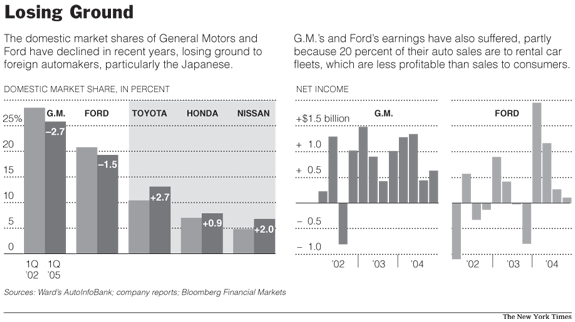 I see that GM just posted a 1.1 billion dollar loss for the quarter. Wow, that’s a lot of money. I found this graphic interesting. It’s from the New York Times and shows that GM lost 2.7% market share in the first quarter of 2005, while Toyota gained 2.7% market share.