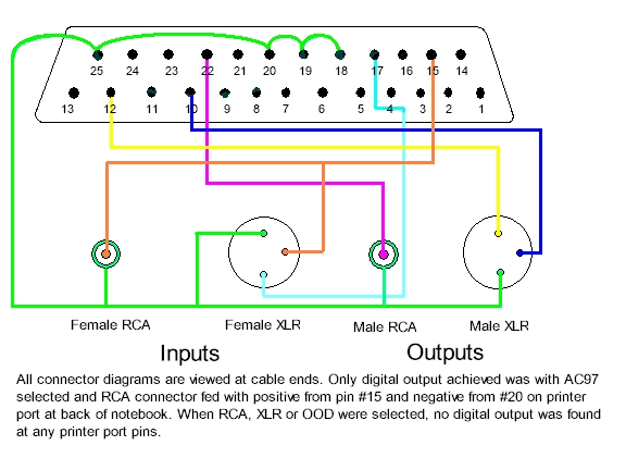 Ooh, this is exciting. I met up online with the guy referred to above as “the person he’s heard of who, through experimentation, found that he could get a S/PDIF signal on two pins of the parallel port.” He goes by the nickname Goldeneared, and gave me this diagram. His note to me was: